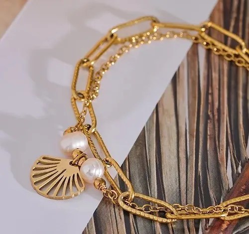 Ce bracelet double rang avec coquillage incarne l’essence de l’univers marin en combinant des breloques en forme de coquillage et une perle délicate sur une base en acier inoxydable de haute qualité. Parfait pour celles qui aiment le style bijou marin, ce bracelet tendance est conçu pour capturer l’esprit de la mer, évoquant les souvenirs des plages de sable fin et des eaux turquoise.
