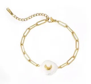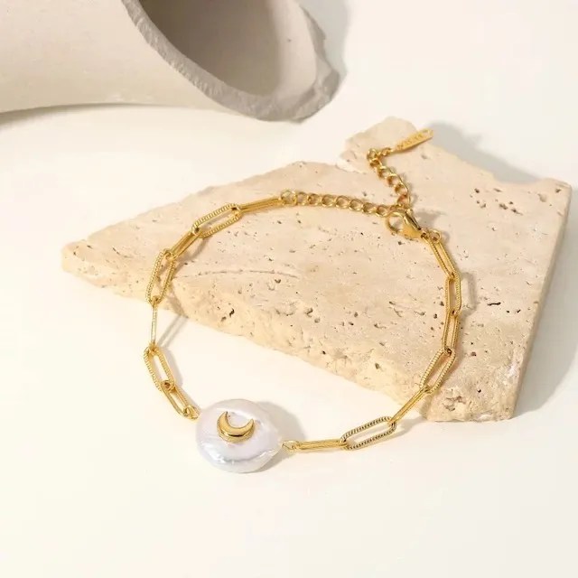 Ce bracelet orné d’une perle avec petite lune est un bijou original et élégant qui se porte facilement au quotidien. Il se composé d’une chaîne grosse maillon en acier inoxydable avec jolie perle.