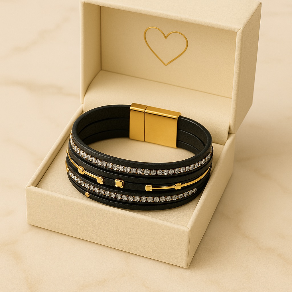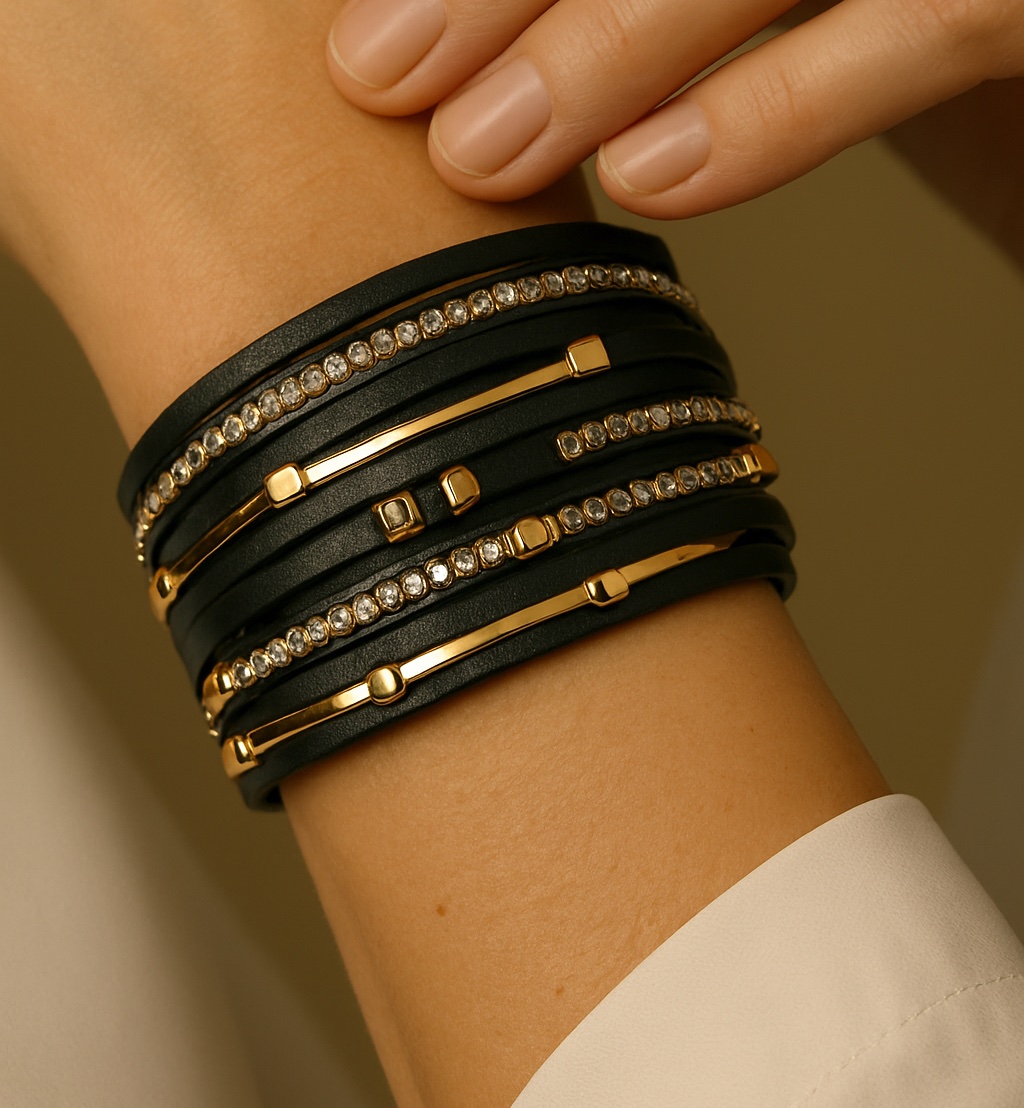 Sublimez vos looks avec ce bracelet multi-rangs en simili cuir noir, embelli de strass blancs et de détails géométriques dorés. Son design raffiné associe plusieurs rangs en un seul bijou, offrant un effet superposé parfaitement équilibré sans effort.