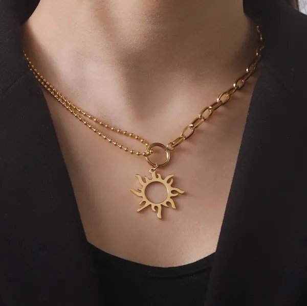 Ce collier soleil composé d’une chaîne grosse maille en acier inoxydable. Un collier léger et facile à porter,  Il ajoute un tendance à votre décolleté.