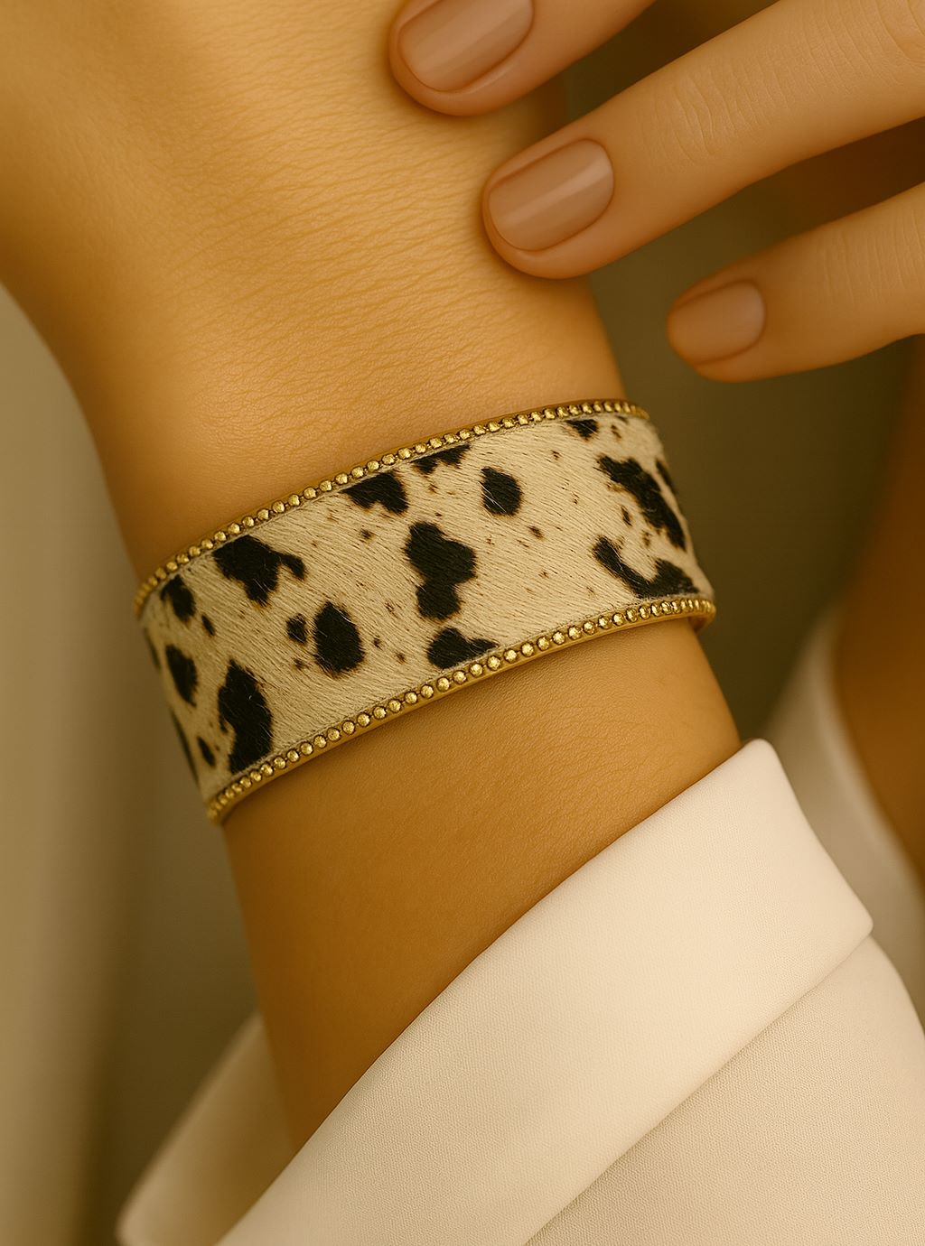 Ce jonc en simili cuir se distingue par son imprimé léopard noir et beige et ses bords métalliques dorés ou argentés. Ajustable, il convient à différents poignets. Il s’associe facilement à des tenues sobres ou au style bohème chic, apportant une touche originale grâce à son imprimé animalier