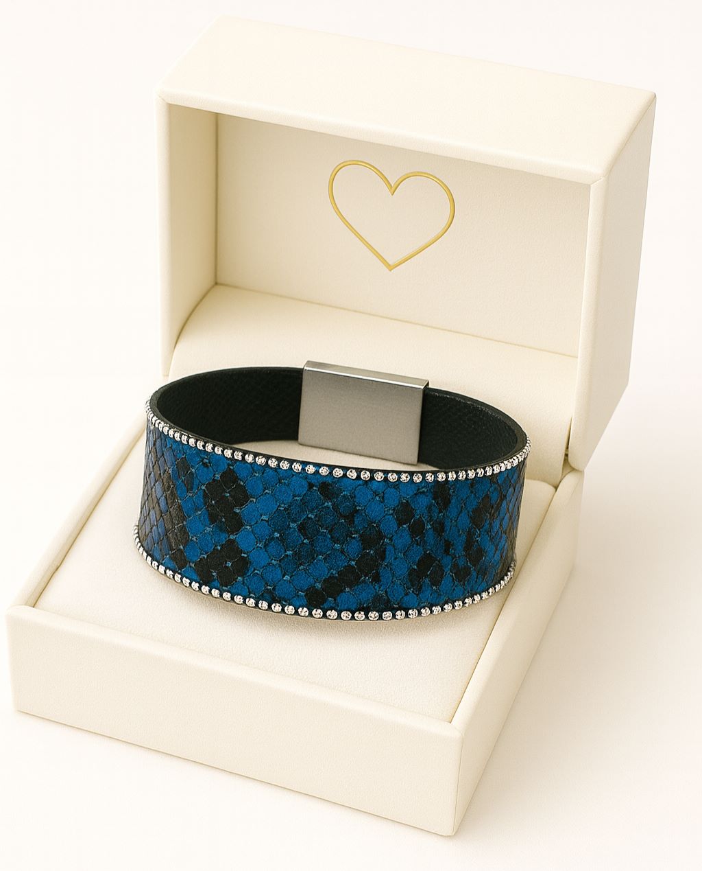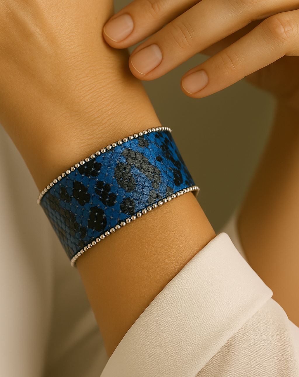 Manchette en simili cuir imprimé python bleu et noir, souligné par une bordure de billes métalliques argentées. Sa structure rigide mais légèrement ajustable permet de l’adapter à la plupart des poignets.
